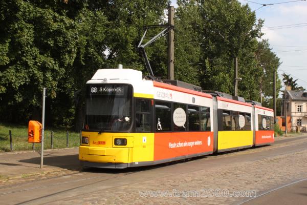 Fahrzeugtyp / Nummer: GT6U / TW-1596 Linie/Beschilderung: 68 / S Köpenick Werbung: GESOBAU Aufnahme: Berlin, (EH) Alt-Schmöckwitz, © T. Kliem, 23.07.2015 |