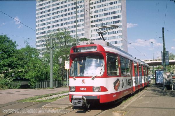 Fahrzeugtyp / Nummer: GT8S / TW-3059 Linie/Beschilderung: 711 / Universität Werbung: ? Aufnahme: Düsseldorf, (EH) Jan-Wellem-Platz, © T. Kliem, 10.05.2001 |