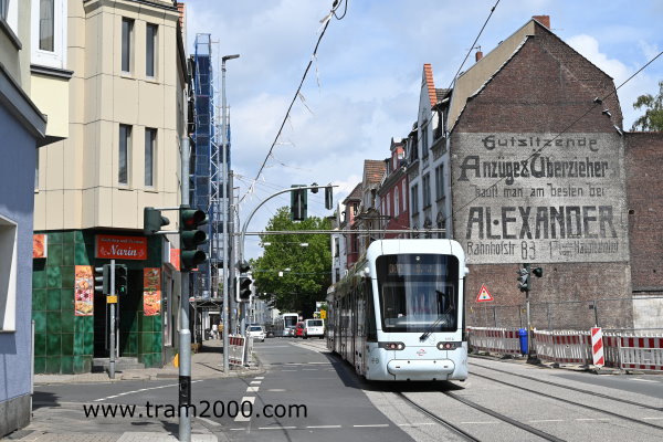 Foto: © Torsten Rack Bei Abrißarbeiten in der Bochumer Straße in Wattenscheid ist eine alte Werbewandgestaltung wieder aufgetaucht. Der VARIOBAHN-Triebwagen 516 befährt am 18. Juni 2020 die Bochumer Straße auf der Linie 302 nach BO-Laer, Laer Mitte. - |
