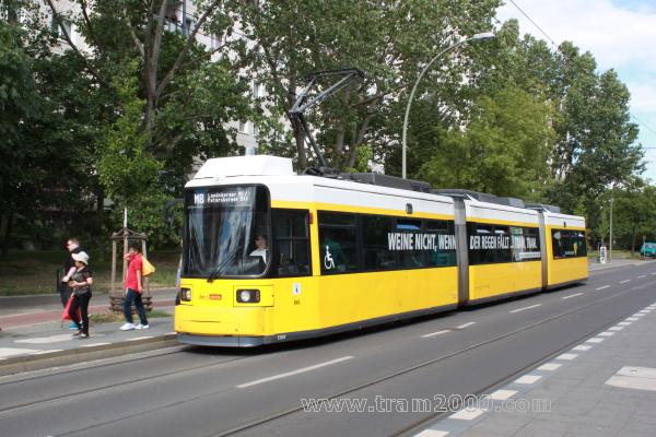 Fahrzeugtyp / Nummer: GT6U / TW-1568 Linie/Beschilderung: M8 / Landsberger Allee, Petersburger Straße Werbung: BVG-Eigenwerbung - Weine nicht wenn der Regen fällt, Tram Tram Aufnahme: Berlin, (H) Bernhard-Bästlein-Straße, © T. Kliem, 04.07.2016 |