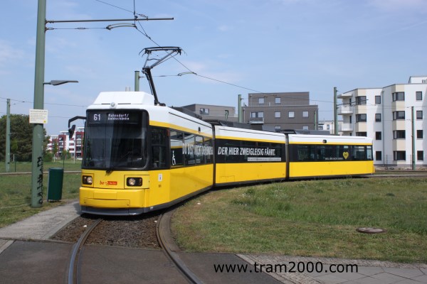 Fahrzeugtyp / Nummer: GT6U / TW-1597 Linie/Beschilderung: 61 / Rahnsdorf Waldschänke Werbung: BVG-Eigenwerbung - Du bist nicht der einzige der hier zweigleisig fährt. Aufnahme: Berlin, (EH) Adlershof Karl-Ziegler-Straße, © T. Kliem, 01.05.2019 |