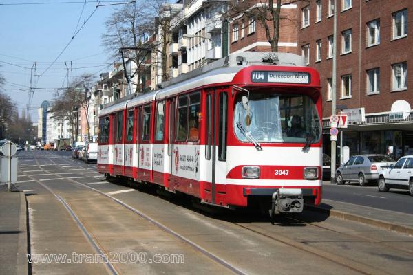 Fahrzeugtyp / Nummer: GT8S / TW-3047 Linie/Beschilderung: 704 / Derendorf Nord Werbung: Jodo-Sportschule Aufnahme: Düsseldorf, Worringer Platz, © T. Rack, 23.03.2006 |