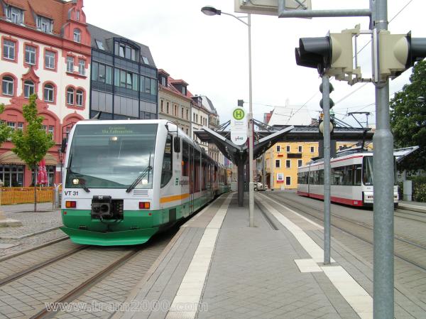 Foto: © Thomas Kliem Seite an Seite halten an der (H) Zwickau Zentrum die Triebwagen der Vogtlandbahn und der Straßenbahn. Bis zur Stadthalle geht es danach gemeinsam auf Dreischienengleisen durch die sächsische Stadt. Dann verlässt die Vogtlandbahn das Stadtgebiet und fährt ins Umland. - |